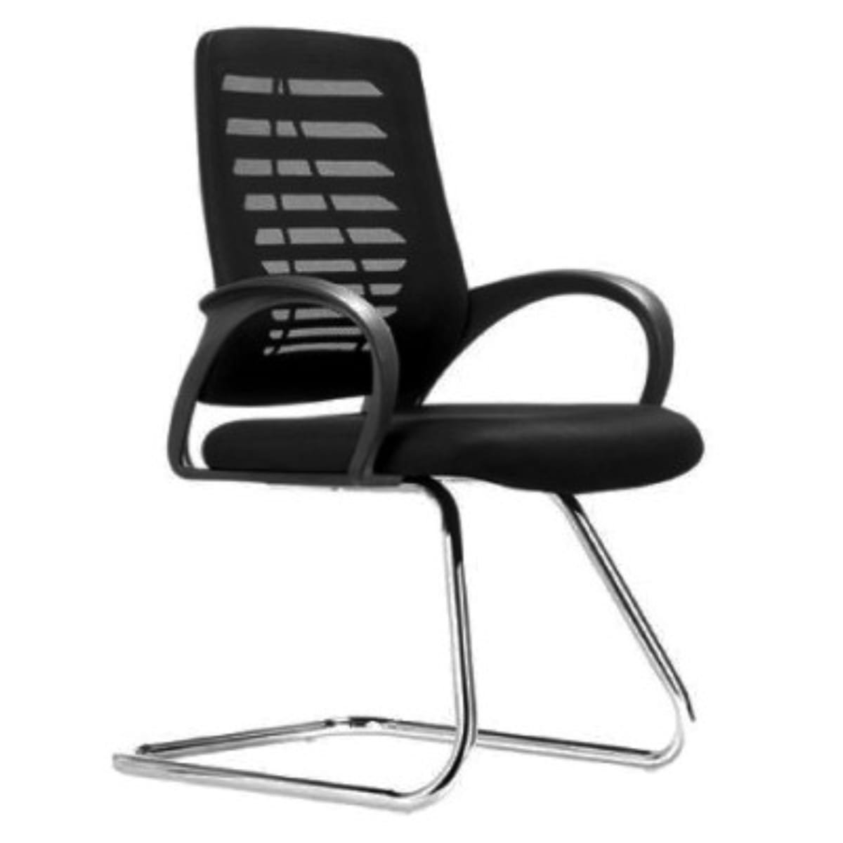 Silla interlocutora, ideal para mesas de juntas y atención al público, marco del espaldar en polipropileno, con malla traslucida de alta resistencia, estructura metálica tipo trineo, apoya brazos fijos, asiento en espuma de alta densidad, tapizado con tela antitranspirante.