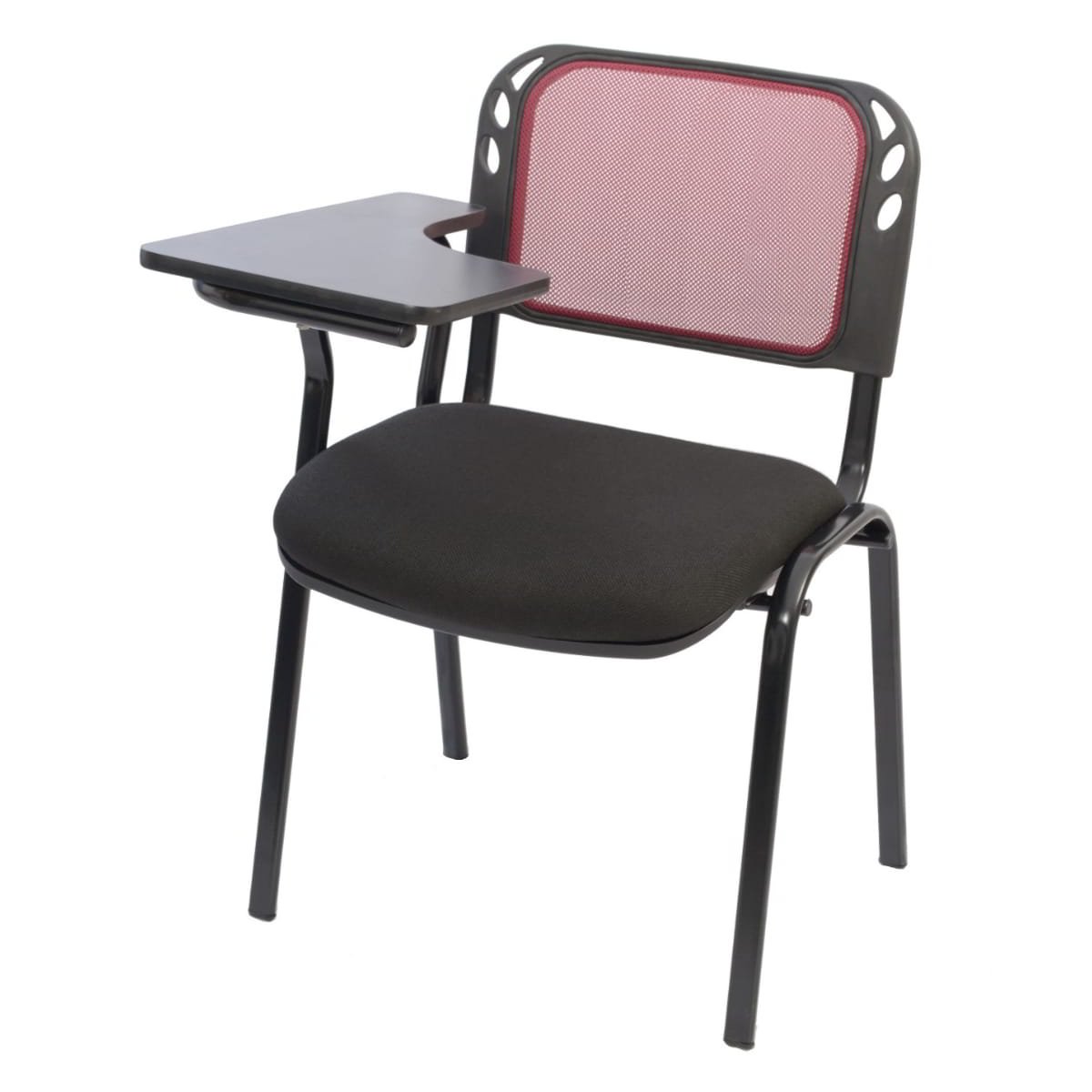 Silla universitaria con espaldar en malla, asiento en espuma de alta densidad, tapizado en tela antitranspirante, estructura metálica con terminación en pintura electrostática, raqueta fija o abatible según elección, variedad colores: negro, azul, verde, vinotinto (según elección y disponibilidad)